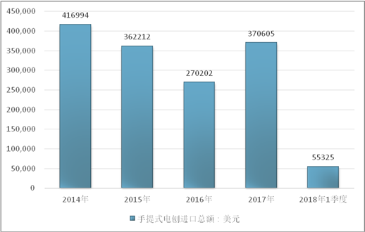 2016年我国手提式电刨进口总额270202美元,2017年进口总额370605美元;2019年1季度进口总额55325美元。