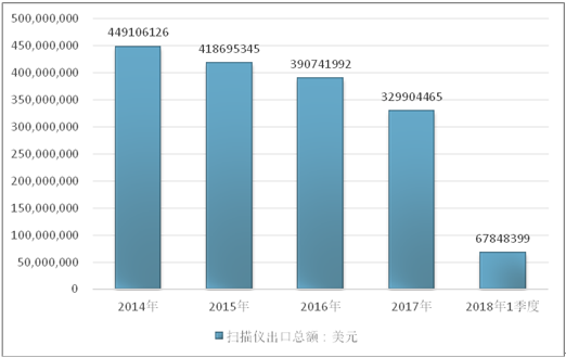 2016年我国扫描仪出口总额390741992美元,2017年出口总额329904465美元;2019年1季度出口总额67848399美元。