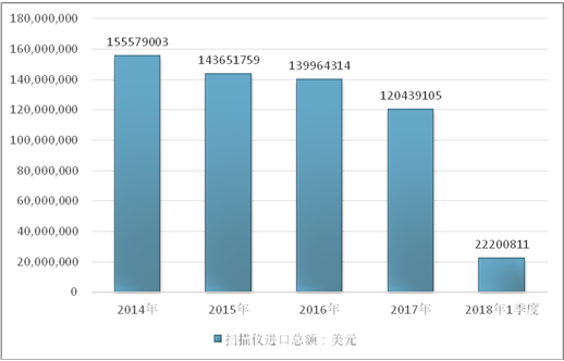 2016年我国扫描仪进口总额139964314美元,2017年进口总额120439105美元;2019年1季度进口总额22200811美元。
