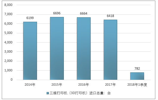 2016年我国三维打印机(3D打印机)进口总量6664台,2017年进口总量6418台;2019年1季度进口总量782台。