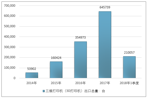2016年我国三维打印机(3D打印机)出口总量354973台,2017年出口总量645739台;2019年1季度出口总量210057台。