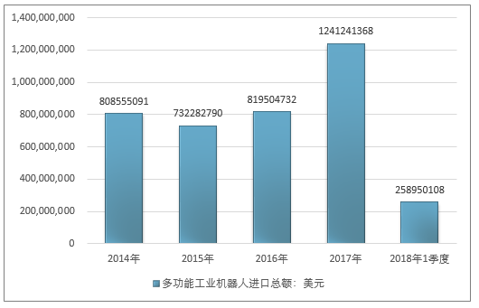 2016年我国多功能工业机器人进口总额819504732美元,2017年进口总额1241241368美元;2019年1季度进口总额258950108美元。