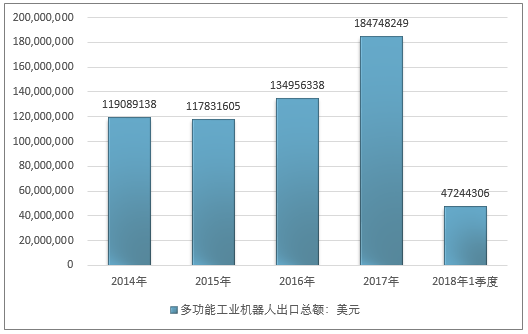 2016年我国多功能工业机器人出口总额134956338美元,2017年出口总额184748249美元;2019年1季度出口总额47244306美元。