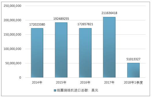 2016年我国线圈绕线机进口总额172657821美元,2017年进口总额211636418美元;2019年1季度进口总额51013327美元。
