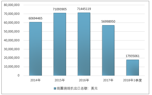 2016年我国线圈绕线机出口总额71445119美元,2017年出口总额56998950美元;2019年1季度出口总额17935061美元。