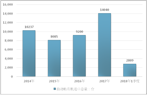 2016年我国自动贴片机进口总量9200台,2017年进口总量14040台;2019年1季度进口总量2809台。