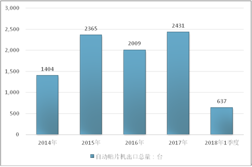 2016年我国自动贴片机出口总量2009台,2017年出口总量2431台;2019年1季度出口总量637台。
