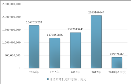 2016年我国自动贴片机进口总额1387913743美元,2017年进口总额2053166649美元;2019年1季度进口总额419326765美元。