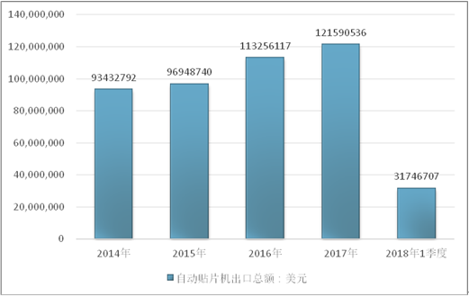 2016年我国自动贴片机出口总额113256117美元,2017年出口总额121590536美元;2019年1季度出口总额31746707美元。