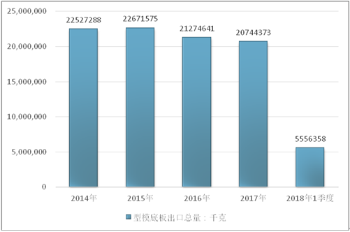 2016年我国型模底板出口总量21274641千克,2017年出口总量20744373千克;2019年1季度出口总量5556358千克。