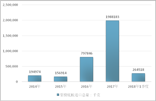 2016年我国型模底板进口总量797846千克,2017年进口总量1988183千克;2019年1季度进口总量264518千克。