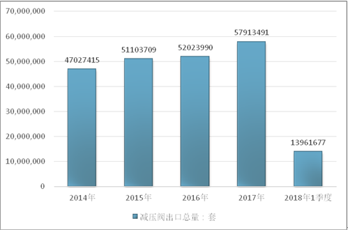 2016年我国减压阀出口总量52023990套,2017年出口总量57913491套;2019年1季度出口总量13961677套。