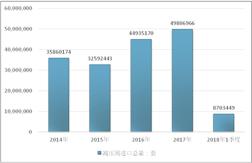 2016年我国减压阀进口总量44935170套,2017年进口总量49806966套;2019年1季度进口总量8703449套。