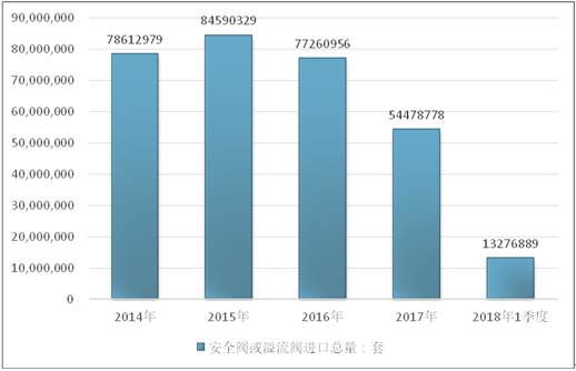 2016年我国安全阀或溢流阀进口总量77260956套,2017年进口总量54478778套;2019年1季度进口总量13276889套。