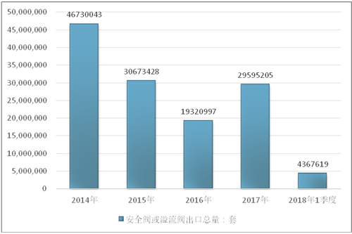 2016年我国安全阀或溢流阀出口总量19320997套,2017年出口总量29595205套;2019年1季度出口总量4367619套。