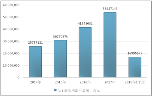 2016年我国电子膨胀阀出口总额41548032美元,2017年出口总额53957149美元;2019年1季度出口总额16895575美元。