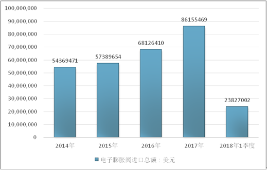 2016年我国电子膨胀阀进口总额68126410美元,2017年进口总额86155469美元;2019年1季度进口总额23827002美元。