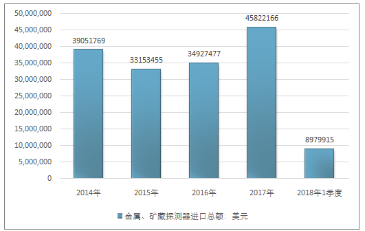 2016年我国金属、矿藏探测器进口总额34927477美元,2017年进口总额45822166美元;2019年1季度进口总额8979915美元。