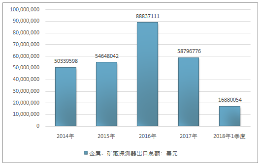 2016年我国金属、矿藏探测器出口总额88837111美元,2017年出口总额58796776美元;2019年1季度出口总额16880054美元。