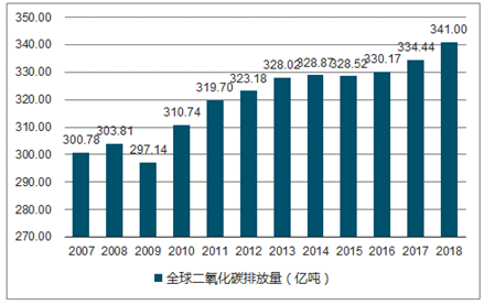 2009年以来,全球二氧化碳排放量持续增长,2017年全球二氧化碳排放量再次刷新历史记录,达到334.44亿吨,同比增长1.29%。全球碳计划组织预测2019年全球碳排放量将增长2%。