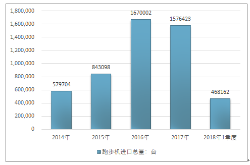 2016年我国跑步机进口总量1670002台 ,2017年进口总量1576423台 ;2019年1季度进口总量468162台 。