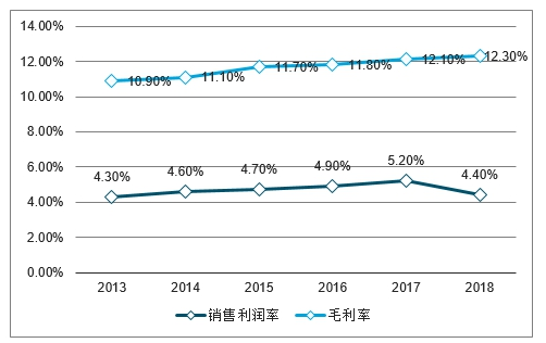 2013-2019年中国电子设备所属行业毛利率及销售利润率走势