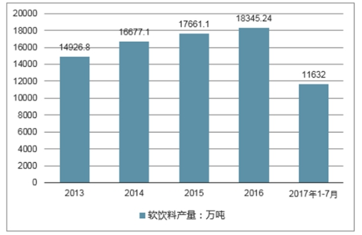 2017年1-7月中国软饮料产量为11632万吨,同比增长7.3%;2016年中国软饮料产量为18345.24万吨,同比增长1.9%。