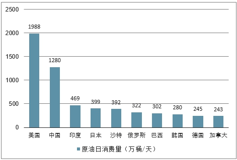 2017年全球原油日消费量前十的国家(万桶/天)
