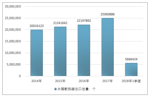 2016年我国水箱散热器出口总量22197892个 ,2017年出口总量25060886个 ;2019年1季度出口总量5666424个 。