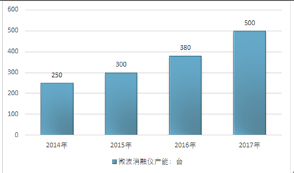 近几年,我国微波消融仪行业产能快速增长,从2014年的250台增长到2017年的500台。如下图所示: