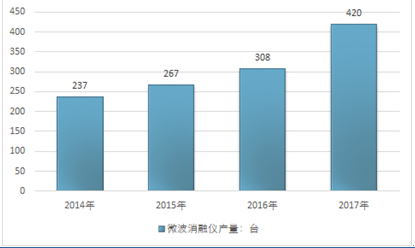 2017年我国微波消融仪产量420台,同比2016年的308台增长了36.4%,近几年我国微波消融仪产量情况如下图所示: