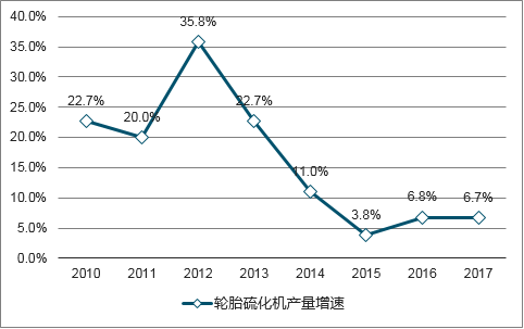近年来,随着全球汽车行业的快速发展以及汽车保有量的不断增加,轮胎需求持续增长,从而带动了轮胎制造商设备投资规模的增长与轮胎硫化机行业的发展。2010年,我国轮胎硫化机产量增速为22.7%,2017年,我国轮胎硫化机产量增速为6.7%。