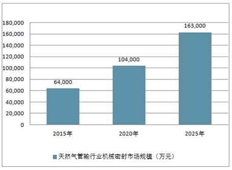 按照每 250 公里配套一个压缩机装置,每套装置对应的机械密封件市场需求为250 万元,对应 2016-2020 年天然气管输机械密封件市场空间为 4 亿元,对应2016-2025 年天然气管输机械密封件市场空间为 9.9 亿元.