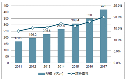 中国近年MEMS传感器市场规模(亿元)