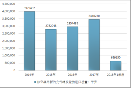 2016年我国航空器用新的充气橡胶轮胎进口总量2954483千克,2017年进口总量3440230千克;2019年1季度进口总量639150千克。