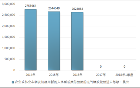 2016年我国农业或林业车辆及机器用新的人字型或类似胎面的充气橡胶轮胎进口总额2623083美元,2017年进口总额-美元;2019年1季度进口总额-美元。