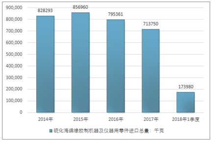 2016年我国硫化海绵橡胶制机器及仪器用零件进口总量795361千克,2017年进口总量713750千克;2019年1季度进口总量173980千克。