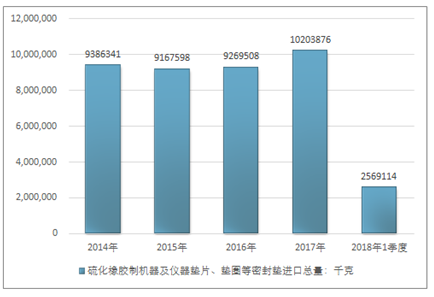 2016年我国硫化橡胶制机器及仪器垫片、垫圈等密封垫进口总量9269508千克,2017年进口总量10203876千克;2019年1季度进口总量2569114千克。