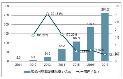 2011-2017年我国智能可穿戴设备市场规模及增速