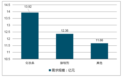 2017年我国化妆品行业对铝质气雾罐需求规模达13.92亿元,除味剂产业需求规模达12.36亿元。