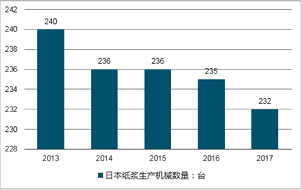 根据日本产经省统计数据显示,近年来,日本纸浆生产机械逐年下滑,由2013年的240台下降至232台。