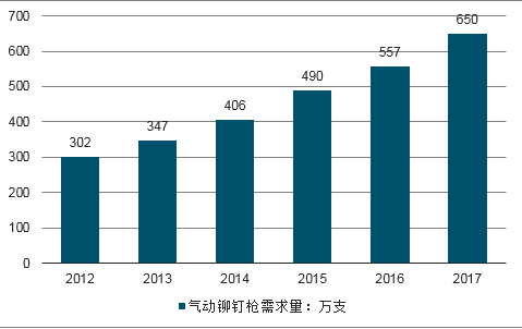 2017年我国气动铆钉枪行业消费量约650万支,同比2016年的557万支增长了16.7%,近几年我国气动铆钉枪行业需求情况如下图所示: