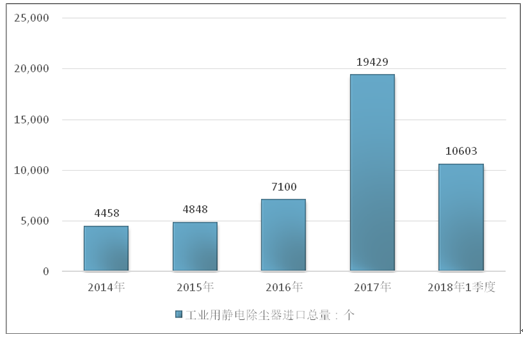 2016年我国工业用静电除尘器进口总量7100个 ,2017年进口总量19429个 ;2019年1季度进口总量10603个 。