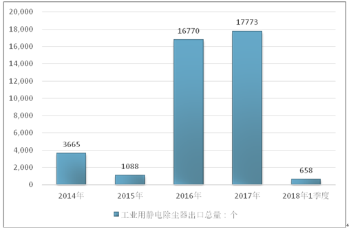 2016年我国工业用静电除尘器出口总量16770个 ,2017年出口总量17773个 ;2019年1季度出口总量658个 。
