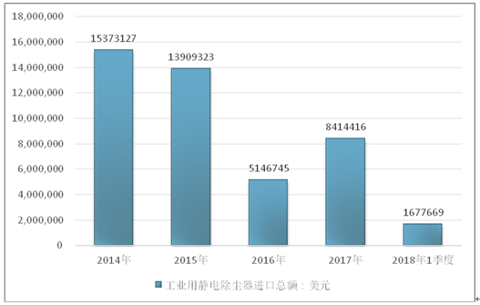 2016年我国工业用静电除尘器进口总额5146745美元,2017年进口总额8414416美元;2019年1季度进口总额1677669美元。
