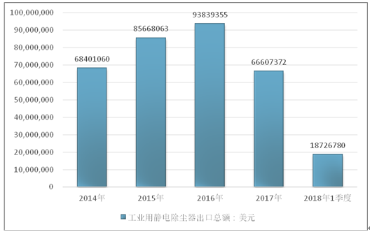 2016年我国工业用静电除尘器出口总额93839355美元,2017年出口总额66607372美元;2019年1季度出口总额18726780美元。