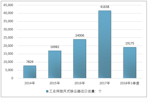 2016年我国工业用旋风式除尘器出口总量24006个 ,2017年出口总量41638个 ;2019年1季度出口总量19175个 。