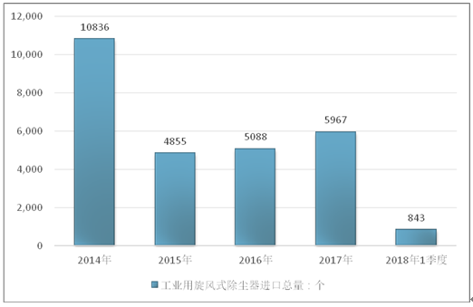 2016年我国工业用旋风式除尘器进口总量5088个 ,2017年进口总量5967个 ;2019年1季度进口总量843个 。