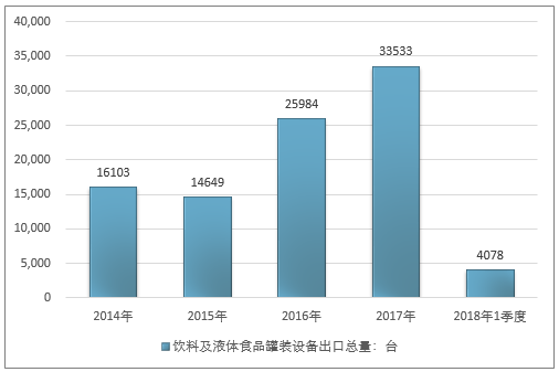 2016年我国饮料及液体食品罐装设备出口总量25984台 ,2017年出口总量33533台 ;2019年1季度出口总量4078台 。