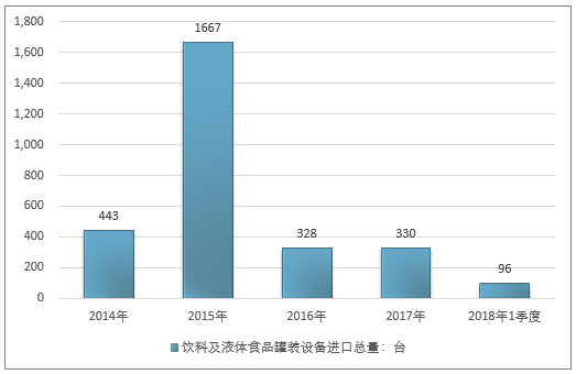 2016年我国饮料及液体食品罐装设备进口总量328台 ,2017年进口总量330台 ;2019年1季度进口总量96台 。